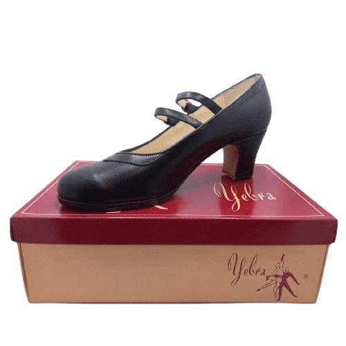 Zapatos de flamenco profesionales Lucía con 2 correas y ancho especial. Nº 34 y 1/2. En piel, de color negro. Escote redondo. Tacón bajo (6cm). Entrega en 24-48h.