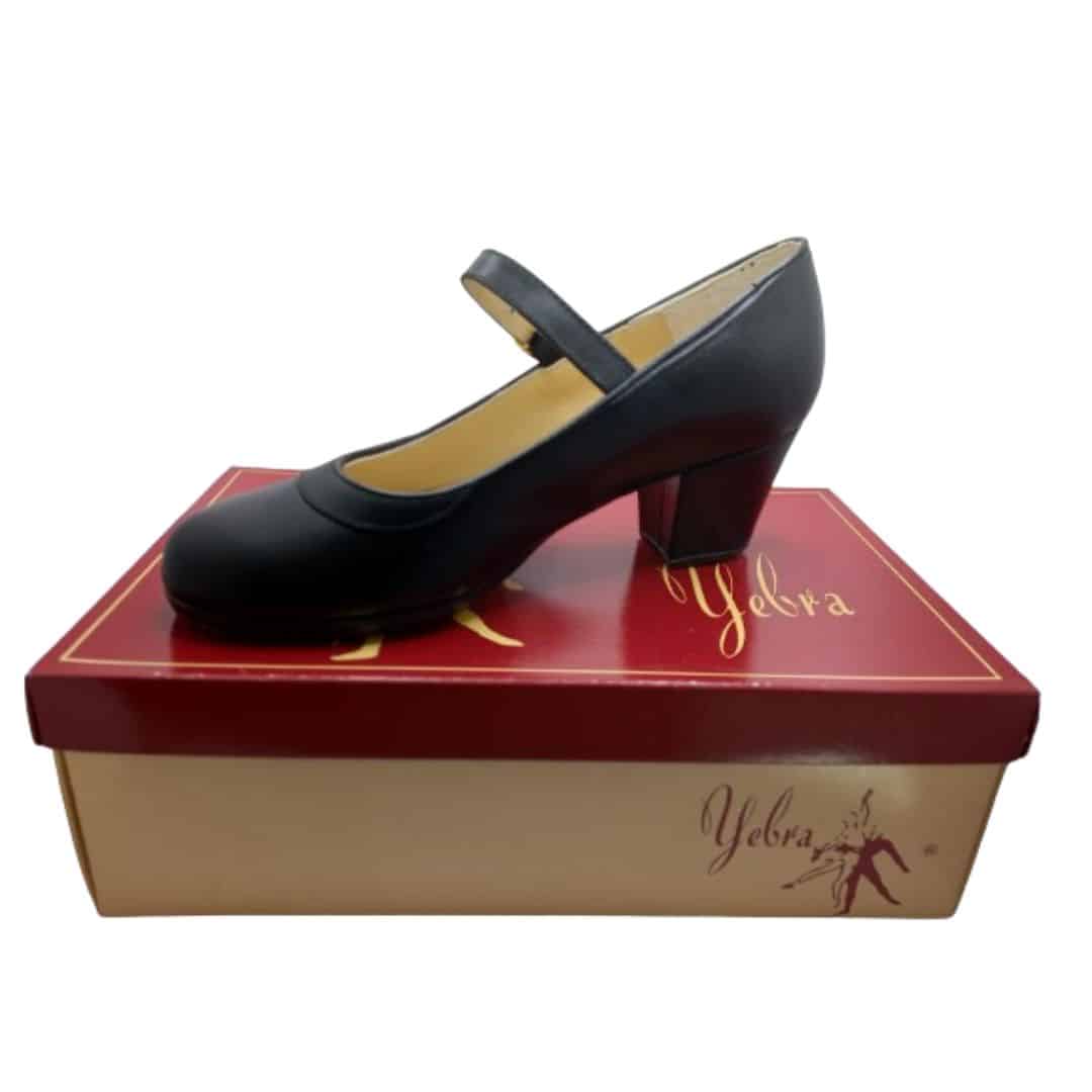 Zapatos de flamenco profesionales Neus, escote redondo, 1correa, en piel negro. Tacón cubano (6cm). Suela cosida a mano. Nº34 y 1/2