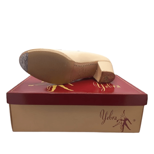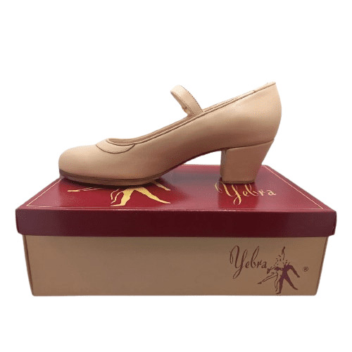 Zapatos de flamenco profesionales Neus, piel beige, escote redondo, tacón cubano (6cm). Suela cosida a mano. Nº36.