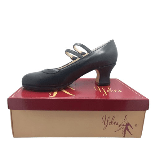 Zapatos de flamenco profesionales Lucía, dos correas, escote redondo, piel negro, tacón semi-carrete, nº40 y 1/2. Suela cosida a mano.