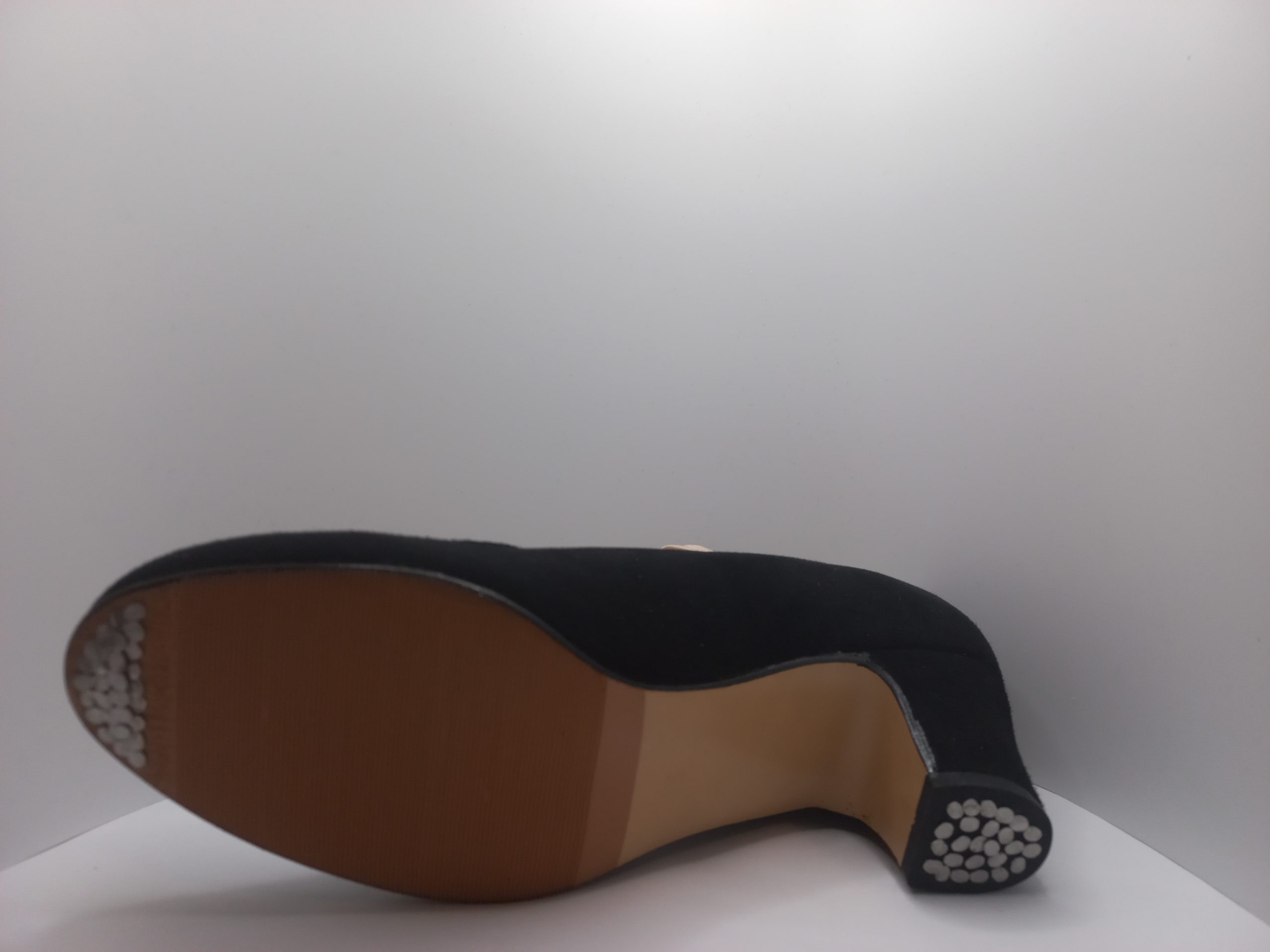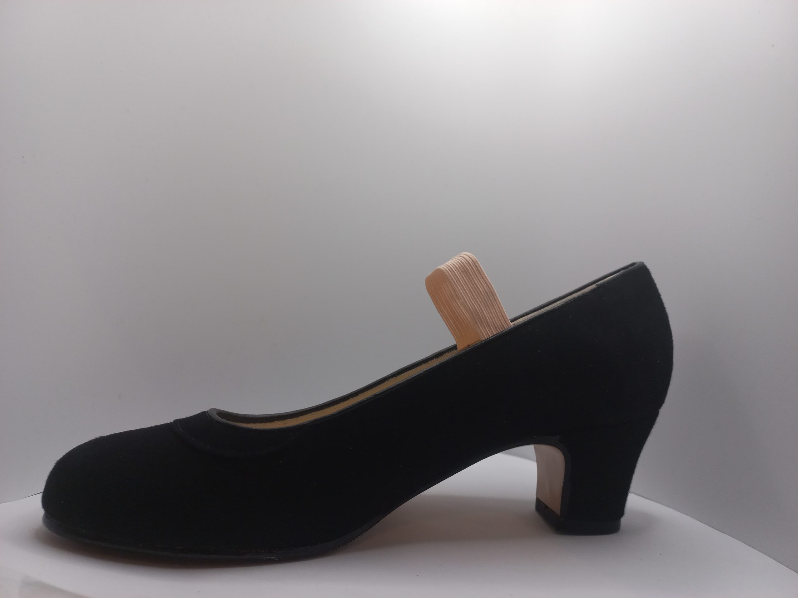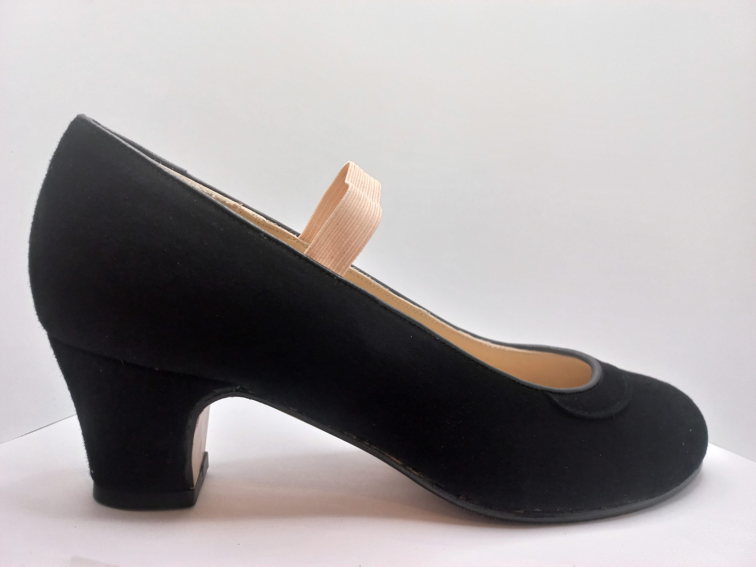 Zapatos de flamenco semiprofesionales en ante. Zapatos de baile flamenco con elástico. Forro y plantilla de piel de primera calidad. Con filis y clavos en puntera y tacón. Tacón de 5,5cm. Especiales para ensayo de baile flamenco y actuaciones.