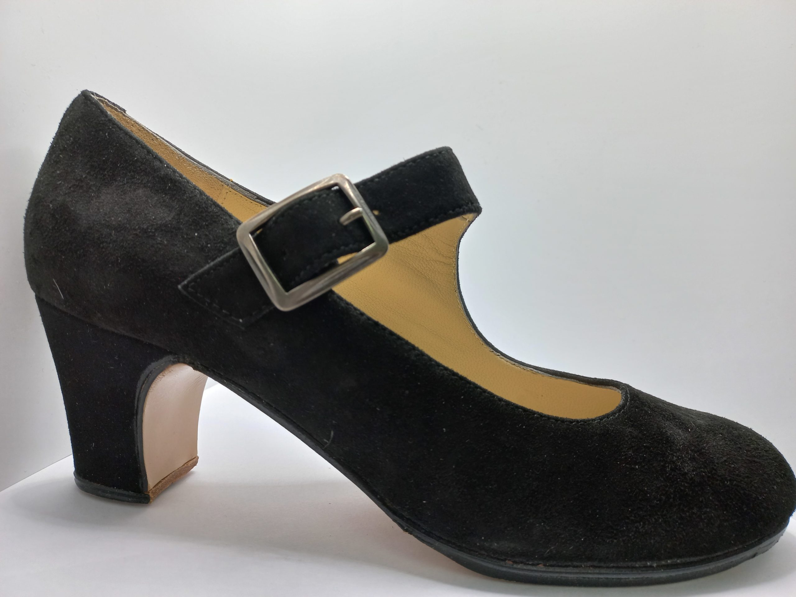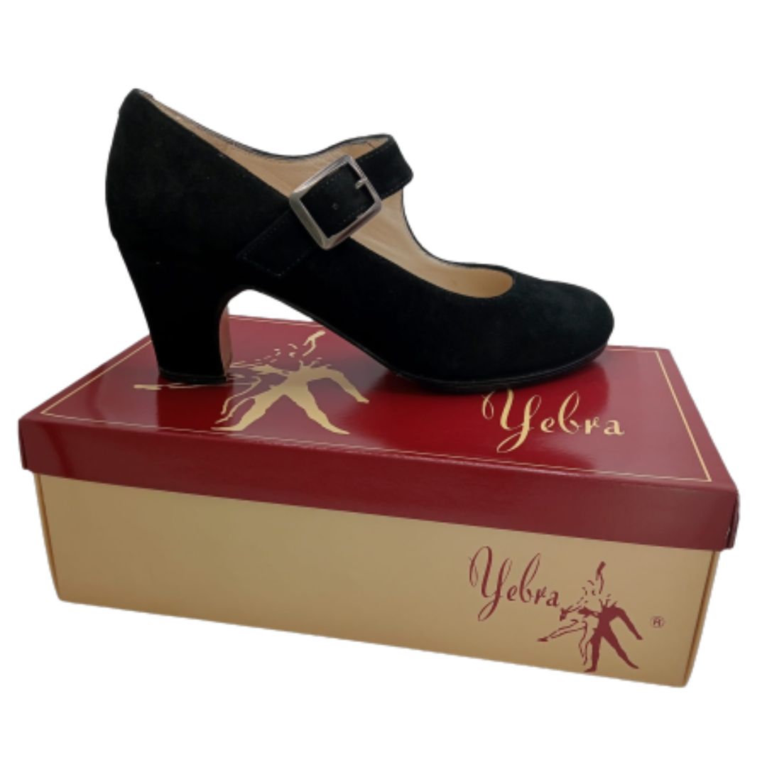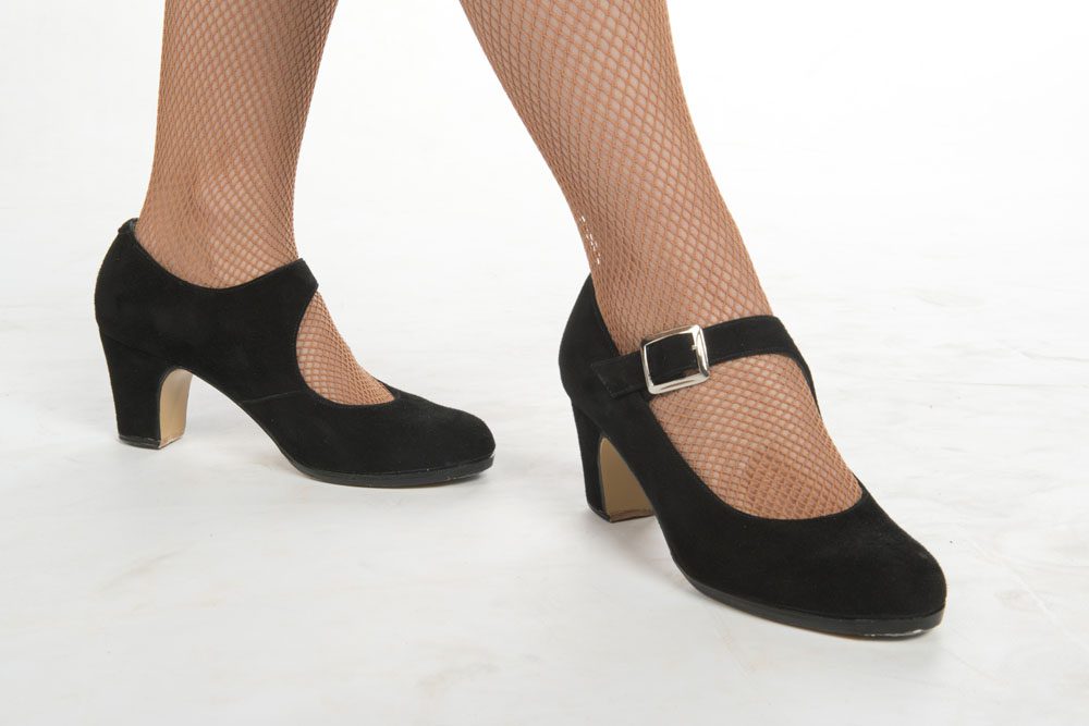 Zapatos de flamenco profesionales Alejandra, en ante negro, nº38 y 1/2, tacón normal (6,5cm). Diseño de correa ancha y hebilla; Muy elegante. Entrega en 24-48h.